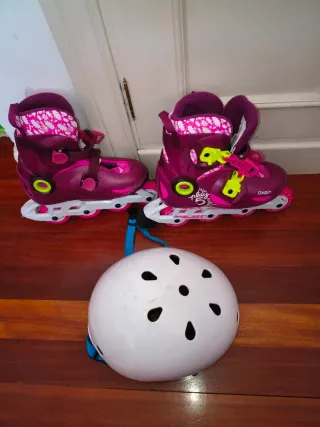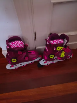 Set de patines en línea Rollerblade en color rosa con embalaje original e instrucciones. Se ajusta la planta del pie y sirven desde el 33 al 36.5. Para atar tienen cordones, velcro y se ajusta al tobillo. Tienen algunas rozaduras pero están poco utilizados, es una gran oportunidad. Precio en tienda solo de los patines superior a 100€. - Incluye 2 pares de rodilleras y un par de coderas. - Bolsa de transporte rosa del Decathlon.