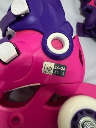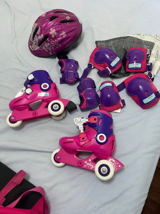 Conjunto de patines y protecciones para niñas. - Patines rosas y morados de tres ruedas. - Casco rosa con diseño floral. - Juego de rodilleras, coderas y muñequeras moradas y rosas. - talla 26 - 28... - con bolsa de transporte incluido. - solo una vez puesto. - regalo otro juego de muñequeras y rodilleras
