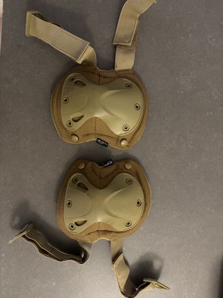 Par de rodilleras tácticas de color beige, diseñadas para actividades deportivas y de exterior. - Diseño ergonómico con protección. - Correas ajustables para un ajuste seguro. - Material resistente y duradero.