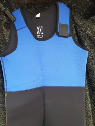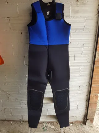 Traje de neopreno de una pieza con la parte superior en azul y la inferior en negro. Ideal para actividades acuáticas. Precio no negociable. - Parte superior sin mangas. - Rodilleras reforzadas.