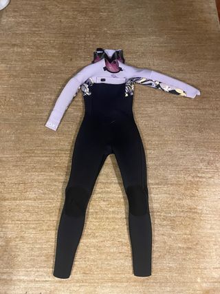 Traje de surf Roxy de manga larga, ideal para deportes acuáticos. Presenta un diseño moderno y funcional. - Color principal negro con detalles en lila y estampado floral. - Cremallera frontal para facilitar su uso. - Rodilleras reforzadas para mayor durabilidad. - Pequeña rotura en la parte inferior