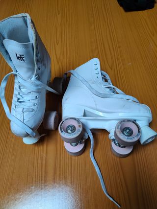Botas patines con ruedas del número treinta y cinco. Lleva a juego completo rodilleras coderas y manetas.