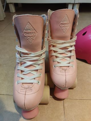 Patines Oxelo rosas en buen estado, ideales para niñas. Se incluyen también protecciones para codos, rodillas y muñecas, y un casco rosa. ¡Perfecto para empezar a patinar con seguridad! - Patines Oxelo de color rosa número 35. - Protecciones para codos, rodillas y muñecas, talla XS. (Una rodillera tiene una fisura pero sigue protegiendo igualmente) - Casco Oxelo de color rosa talla 55-58 cm. - Roller Skate Kit, para decorar tus patines.