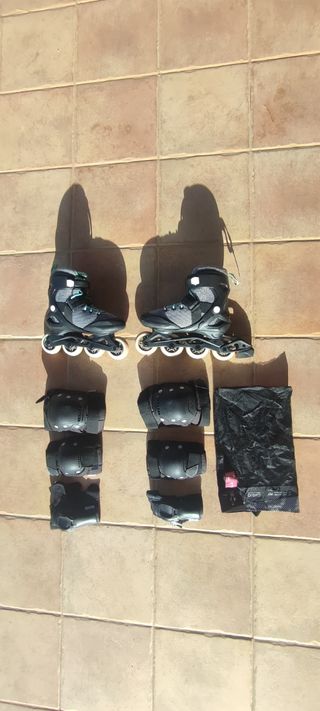 Patines de línea para adulto, talla 39. Incluyen un juego completo de protecciones: rodilleras, coderas y muñequeras. También se incluye una bolsa de transporte para las protecciones. - Patines de línea. - Protecciones en buen estado. - Bolsa de transporte incluida.