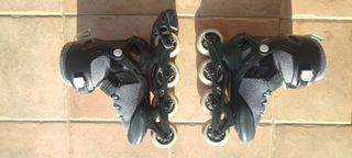 Se venden patines en línea Oxelo talla 43 junto con un juego completo de protecciones. - Patines en línea negros. - Incluye rodilleras, coderas y muñequeras. - Bolsa de malla para guardar el equipo. Ultimo precio.
