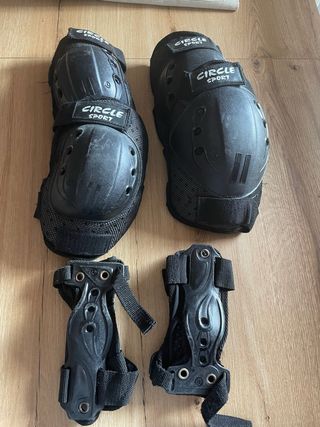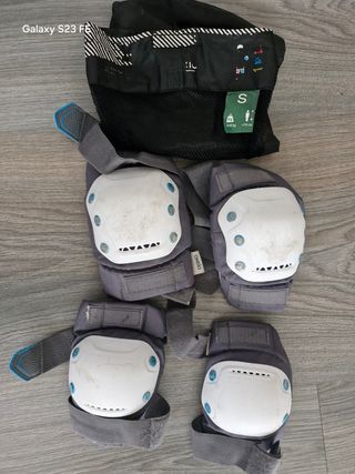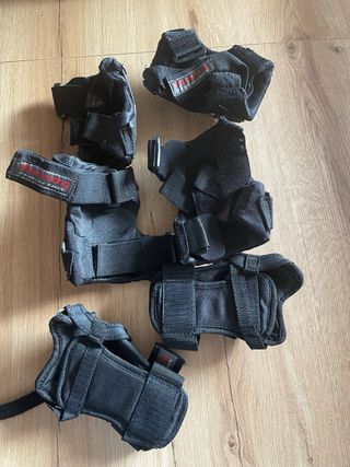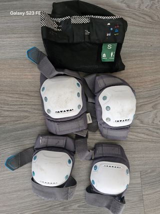 Conjunto compuesto de Rodilleras, Coderas y Muñequeras. Espuma EVA con forro de malla, tapas de PP de alto impacto, correas elásticas ajustables con cierre de velcro. Talla S: Talla de zapato 28-31. En perfecto estado, poco uso