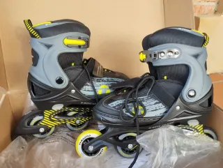 Patines en línea de la marca Tijuana, ajustables en talla, de 38 a la 42. Usados una sola vez. Se regalan rodilleras. Con embalaje original. - Diseño en color gris, negro y amarillo. - Cierre con cordones y velcro. - Ruedas de color amarillo.
