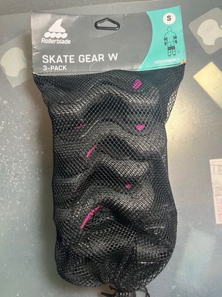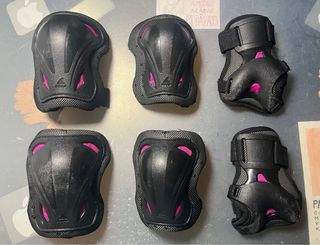 Set de protecciones Rollerblade para patinar. - Incluye rodilleras, coderas y muñequeras. - Talla S. - Diseño en color negro con detalles en rosa. - Vienen en una bolsa de malla negra. Pequeños rozaduras en plásticos externos, el resto en perfectas condiciones.