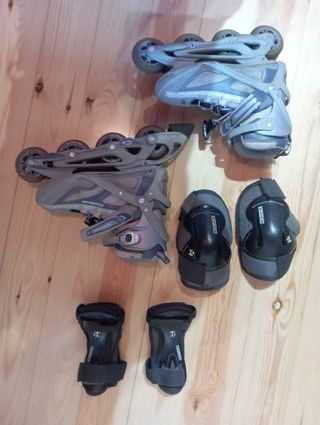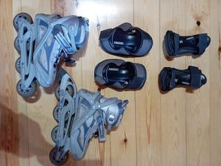 Patines en línea, usados pero en buen estado. Ideales para iniciarse en el patinaje. Talla 40-41 - Incluye dos pares de patines en línea. - Se incluyen protecciones: rodilleras, coderas y muñequeras. - Los patines son de color gris y azul.