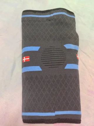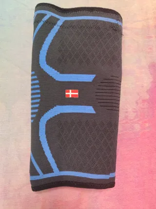 Rodillera deportiva de compresión en talla S. Diseñada para ofrecer soporte y comodidad. - Tejido elástico y transpirable. - Diseño anatómico. - Banda de sujeción superior e inferior. - Detalles en color azul y bandera de Dinamarca.