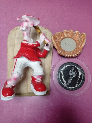 Conjunto de artículos de béisbol. - Figura de jugador de béisbol con bate. - Guante de béisbol. - Metacrilato decorativo con figura de lanzador. - rodillera antigua de colección
