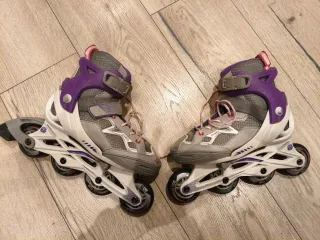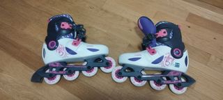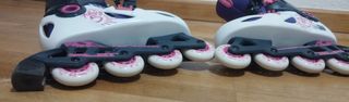 Patines en línea Oxelo Play 5 para niña, en color blanco, morado y rosa. - Talla: 34-36. - Diámetro de rueda: 63 mm. - Cierre con cordones, velcro y hebilla. - Diseño divertido con estampado. Regalo protecciones para muñecas, codos y rodillas talla m/l de niño. Tienen marcas de rozadura, sobre todo las rodilleras.