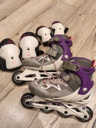 Set de patines en línea Decathlon ajustables. - Talla: 32-35 - Color: Gris y morado - Incluye protecciones (rodilleras y coderas)