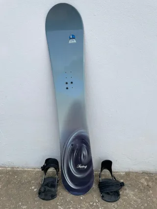 Tabla de snowboard con un diseño degradado en tonos grises y azules, con un remolino oscuro en la parte inferior. Incluye fijaciones. - Diseño degradado. - Remolino oscuro en la base. - Fijaciones incluidas.