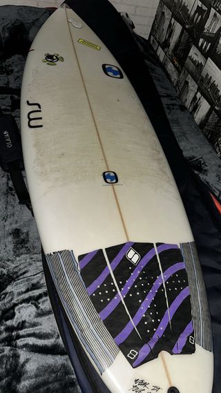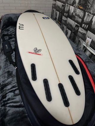 Tabla de surf blanca con quillas negras. - Diseño con línea central de madera. - Speed Rabbit. - Logo MS TIENE REFUERZO DE CARBONO -TIENE 2 baños la vendo porque ni tengo tiempo de usarla. Nueva. 6,3