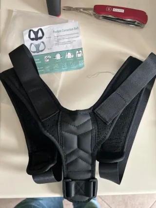 Este corrector de postura es de color negro y está diseñado para ayudar a mejorar la postura. - Fabricado con material transpirable. - Diseño ligero y cómodo. - Ajustable para un ajuste personalizado.