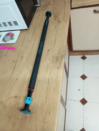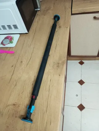 Barra de dominadas extensible para puertas. - Color negro con detalles en azul y rojo. - Mecanismo de ajuste giratorio.