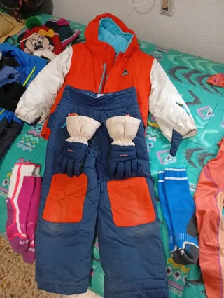 ropa de esquí para niñ@ de 5 años decathlon. chaqueta, pantaló 30€ guantes 5€ 1 camiseta termica 5€ 1 pantalón termico 5€ dos pares de calcetines termicos 5€ botas de nieve talla 32 5€ botas nieve talla 34 10€ botas esquí 15 € La chaqueta y el pantalón están sin lavar desde el último uso.