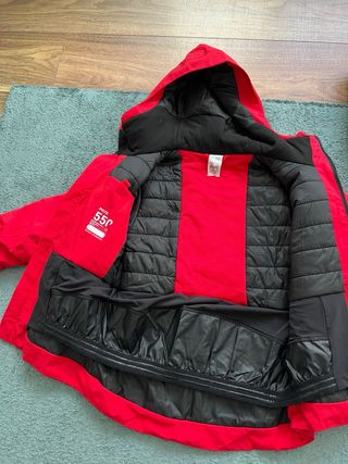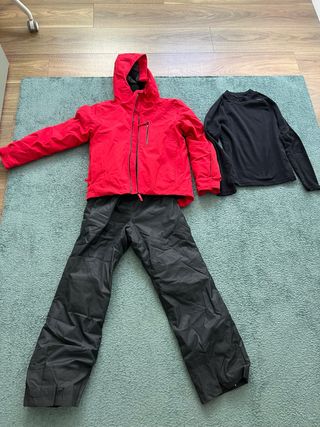 Conjunto de ropa para esquiar, ideal para mantener el calor y la comodidad en la montaña. Incluye chaqueta y pantalón. Todo de la talla 10, pero es bastante amplio, se ha usado con 12 años. De decathlon. - Chaqueta de esquí roja con capucha. - Pantalón de esquí negro. - Prenda interior negra de manga larga.