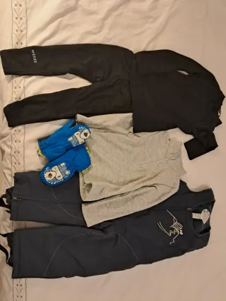 Conjunto de ropa de esquí para niños de 3 a 4 años. - Pantalón térmico negro Wedze - Camiseta térmica negra Wedze - Camiseta térmica gris con cremallera. Odlo - Mono ski azul Wedze - Manoplas azules Wedze