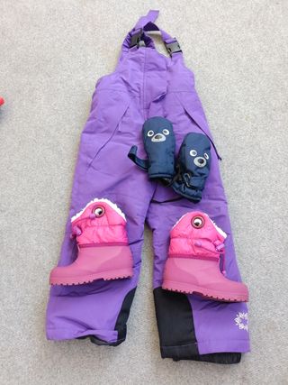 Conjunto de ropa de nieve para niña en color morado, en buen estado. - Peto de nieve morado 2-4 años talla 98/104.. - Manoplas azules con diseño de oso. - Botas rosas con forro interior blanco talla 22/23 Entrego en Pinseque, Utebo o Actur.