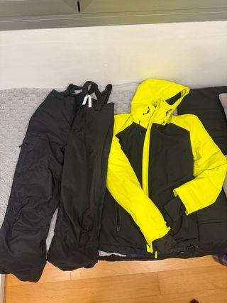 Conjunto de ropa de nieve para actividades al aire libre. - Chaqueta de color amarillo y negro. - Pantalón de color negro con tirantes son impermeables y muy cómodo.