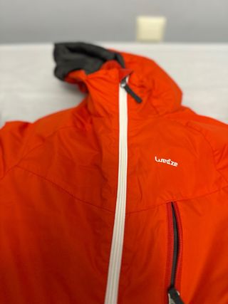 Conjunto de ropa de nieve de la marca Wedze, ideal para disfrutar de la montaña y nieve - Chaqueta negra, roja y blanca. - Pantalón negro. - Diseño deportivo y funcional. - Talla L.