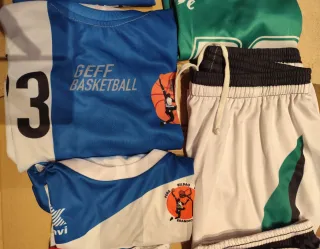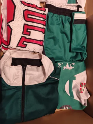 Conjunto de ropa deportiva para baloncesto. - Camiseta blanca con detalles rojos y negros. - Pantalón corto verde. - Chaqueta deportiva verde con cremallera y detalles blancos. - Otra prenda deportiva verde con escudo.