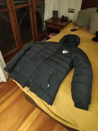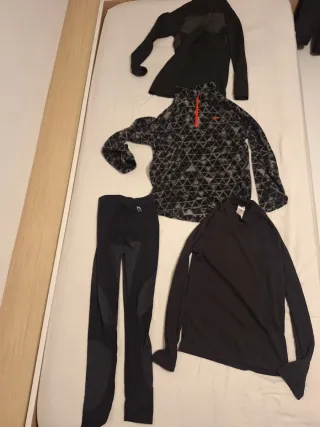 Conjunto de ropa deportiva ideal para el invierno. Incluye varias prendas. - Chaqueta negra con detalles blancos. - Camisetas de color azul. - Pantalones negros.