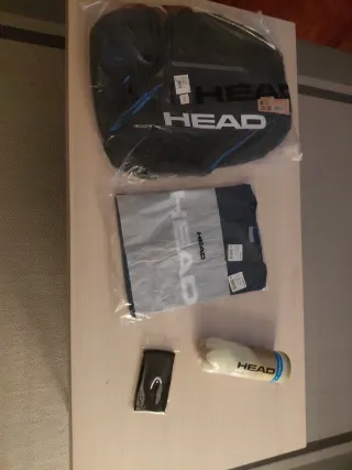 Conjunto deportivo de la marca HEAD para hombre. Incluye varios artículos para la práctica de deportes. - Bolsa de deporte negra con logo HEAD. - Prenda de ropa deportiva gris y negra con logo HEAD. - Muñequera negra con logo HEAD. - Bote de pelotas HEAD.