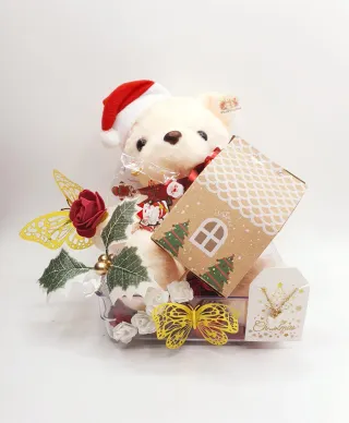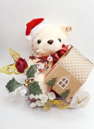 Este adorable oso de peluche viene vestido para la ocasión con un gorro de Papá Noel y un collar festivo. Es un regalo perfecto para estas fiestas. - Incluye un collar con colgante. - Viene con una casita de jengibre decorativa. - Adornado con mariposas y flores artificiales. (PELUCHES PERSONALIZADOS A TU GUSTO, CONTACTA CONMIGO Y TE PERSONALIZARÉ TU PELUCHE: 620760168
