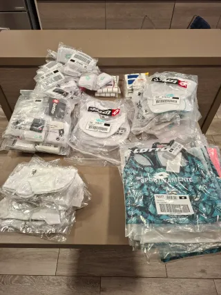 Lote variado de ropa y accesorios para tenistas. - Calcetines blancos. - Gorras y viseras blancas - Grips para raquetas. - Ropa deportiva Lotto con estampado. - La ropa de chica talla M Se pueden vender por lotes separados y a convenir