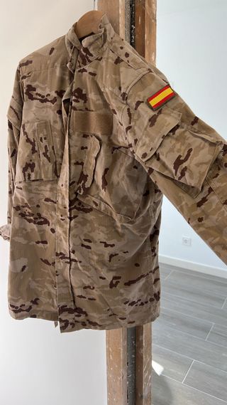 Chaqueta y pantalón militar con estampado de camuflaje desértico y bandera de España. - Diseño con múltiples bolsillos. - Cierre de botones. - Parche de la bandera de España en la manga. preparado para airsoft