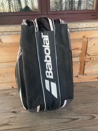 Raquetero Babolat Pure x 12 raquetas Presenta 4 bolsillos: - Uno para pequeños compartimentos como llaves o telefono movil. - Seguido de un bolsillo para ropa,zapatillas,pelotas. También se pueden meter raquetas (3-4) -Un bolsillo central con el espacio para 6 raquetas. - En el otro lateral se podrían meter mas raquetas o ropa deportiva ,complementos para llevar a tus partidos o entrenamientos. -Consta de un ultimo bolsillo para uniformidad, zapatos pelotas etc. El estado del es perfecto, quitando un agujero en un bolsillo central del raquetero. Las lineas blancas donde insertan las cremalleras presentan ligera suciedad Ideal