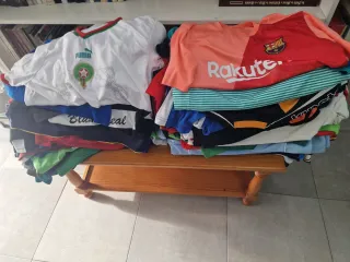Lote de ropa deportiva, ideal para aficionados al fútbol y otras disciplinas. - Camiseta blanca con logo Puma y escudo. - Camiseta bicolor (rosa y roja) con logo Rakuten y escudo. - Varias camisetas y prendas deportivas adicionales. Hay entre 150 a 200 prendas