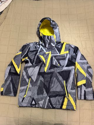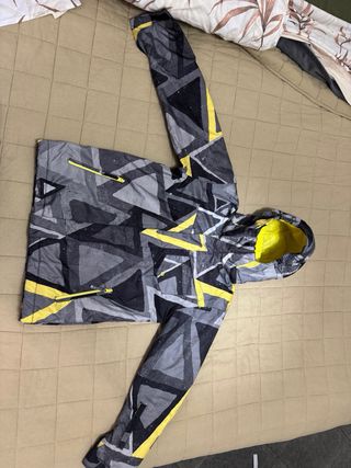 Conjunto de ropa deportiva Quiksilver para deportes de nieve. Diseño moderno y llamativo. - Chaqueta con capucha. - Estampado geométrico en tonos grises, negros y amarillos. - Cremalleras de color amarillo. - Bolsillos frontales con cremallera.