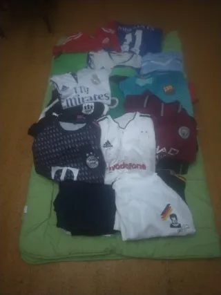 Conjunto de ropa deportiva para fútbol. - Camisetas y pantalones. - Diseños variados de equipos. 14 equipaciones de diferentes tallas desde la 18 a la 28 y botas de fútbol decathlon nuevas talla 32.