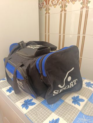 "Bolsa deportiva en buen estado, estilo sencillo y funcional. Se lleva al hombro con bandolera. Cierre con dos varillas que se pueden anudar, sin cremallera ni velcro. Forma tubular/redonda: diámetro 27 cm, altura 45 cm. Ideal para guardar ropa deportiva o varios objetos. Práctica y lista para usar.
