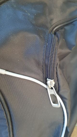 Bolsa deportiva o de viaje de la marca Transrutas. Está en buenas condiciones y es ideal para llevar ropa, calzado u otros objetos. - Color azul y negro. - Asa para llevarla al hombro. - Cordón para ajustar la abertura. - Bolsillo frontal con cremallera.