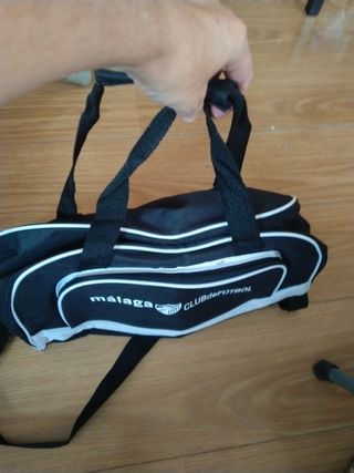Bolsa deportiva del Málaga Club de Fútbol. Está en buenas condiciones. - Es de color negro con detalles blancos. - Tiene una asa de mano y una correa para el hombro. - Ideal para llevar ropa y calzado deportivo.