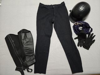 Conjunto de equitación completo necesario para cursar el GFGM de GUIAMN - Dos pantalones de montar negros de hombre, talla M. - Polainas de montar. - Casco de equitación negro. - Guantes de montar negros. - Ramal de equitación. Conjunto utilizado realmente 15 días, por lo tanto esta en perfecto estado.