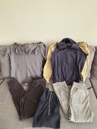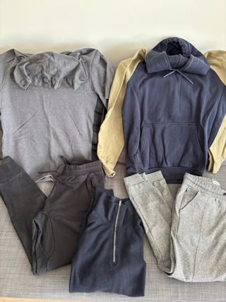Conjunto de cinco prendas deportivas para hombre. Incluye sudaderas y pantalones. - Sudadera gris con capucha. - Sudadera azul marino con mangas beige y bolsillo. - Pantalones grises oscuros. - Pantalones grises claros. - Prenda azul marino con media cremallera.