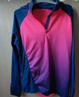 Conjunto de ropa deportiva para niña . Una chaqueta, un pantalón y dos camisetas de manga larga. Talla 12. - Chaqueta con capucha y cremallera. - Diseño degradado en tonos rosa, morado y azul. - Mangas largas de color azul marino. - Bolsillo lateral con cremallera.