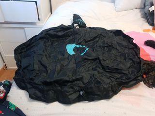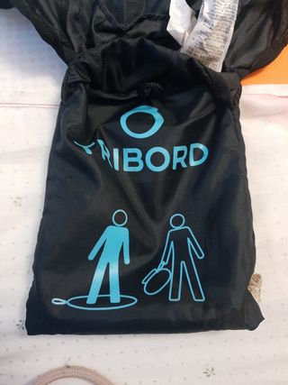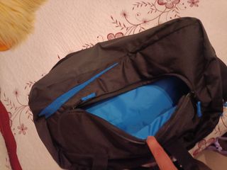 Bolsa de deporte de la marca Domyos. Está en buen estado y es perfecta para llevar tu ropa y calzado deportivo. - Incluye un colgador. - Tiene un compartimento principal con cierre de cremallera y un bolsillo frontal con cremallera. - Color negro y azul.