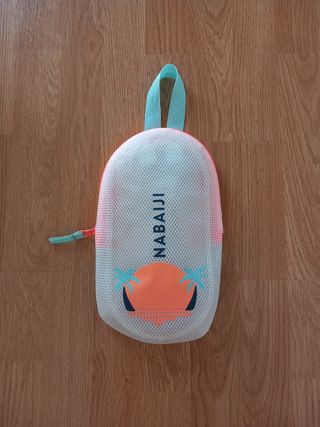 Bolsa de natación Nabaiji de 3 litros, ideal para llevar tus cosas al gimnasio o a la piscina. Es de color blanco con detalles en naranja - Asa superior para colgar. En perfectas condiciones Para transportar tu ropa húmeda