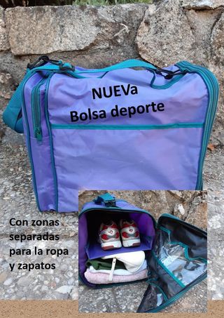 Bolsa viaje deporte nueva a estrenar. * Doble cremallera para cerrar con candado. * Cremallera en el lateral que abre completamente para poder introducir la ropa con comodidad. Balda en medio que se puede quitar con automáticos para dejar el espacio diáfano o poder partirlo como en las fotos. Así se puede llevar por separado calzado y ropa por ejemplo. Bolsillo lateral para llevar ropa aparte, como la mojada de piscina. Y dos bolsillos, uno en la parte de delante y otro en la parte de detrás. Lateral que abre lleva pequeños bolsillos para artículos de higiene. Asa parte superior y bandolera. Se vende bolsa vacía,sin los productos.
