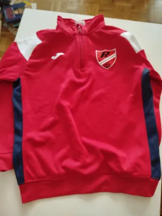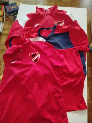Conjunto de ropa deportiva del Club Fuentelareyna. 12 años - Chaqueta deportiva roja con cremallera. - Camiseta roja con detalles en azul marino y escudo. - Camiseta roja de manga corta con escudo.