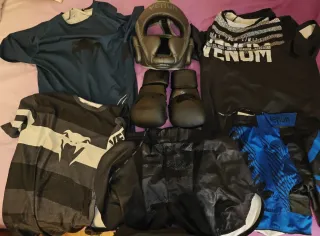 Pack de guantillas de MMA de la marca Venum. - Guantillas de MMA Challengers 3.0, L/XL - Casco venum Elite talla única usado (vendido) - Short negro Venum de MMA talla, L vendido - Short Azul Venum de MMA, talla L vendido - Camiseta Venum negra dry tech, talla L - Camiseta Venum azul dry tech, talla L - La camiseta Venum de rayas y color negra si compras el pack entero la regalo, talla L La el casco y la ropa son usadas, la ropa se entregará lavada y el casco limpio, las guantillas igualmente se las limpiará. Recordatorio la cosas son usadas pero están en buen estado excepto las guantillas de MMA que están como nuevas y solo las