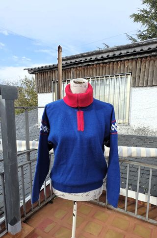 Jersey de estilo vintage, ideal para esquí o uso casual. Diseño unisex. - Color azul principal. - Cuello alto rojo con cremallera. - Detalles de rombos blancos en mangas.Jersey de esqui de estilo vintage. Es de color azul brillante con detalles en rojo, incluyendo un cuello alto y una cremallera corta en el pecho. Presenta un diseño de punto Fair Isle en las mangas, con motivos geométricos en blanco y rojo. Tiene un aspecto clásico, reminiscente de la ropa deportiva de los años 70 u 80. #vintage