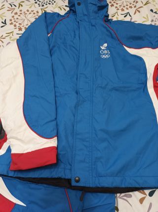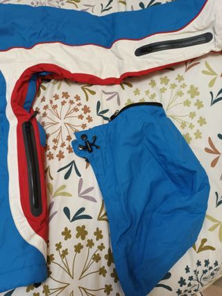 Conjunto de ropa deportiva para esquiar, incluye pantalón y chaqueta de regalo - Chaqueta con detalles en blanco y rojo. - Cremalleras negras. - Capucha azul.